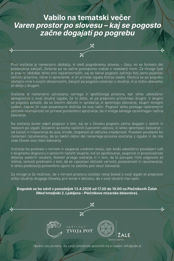 V ponedeljek, 13. aprila 2026, bo med 17.30 in 19.00 na Plečnikovih Žalah v Ljubljani potekal tematski večer »Varen prostor po slovesu – kaj se pogosto začne dogajati po pogrebu«, ki ga organizira Inštitut Tvoja pot v sodelovanju s podjetjem ŽALE Javno podjetje, d.o.o. Dogodek je namenjen obdobju po pogrebu, ko se življenje postopoma vrača v vsakdan, hkrati pa se pri mnogih začnejo intenzivneje pojavljati občutki praznine, tišine in sprememb ob izgubi bližnje osebe.